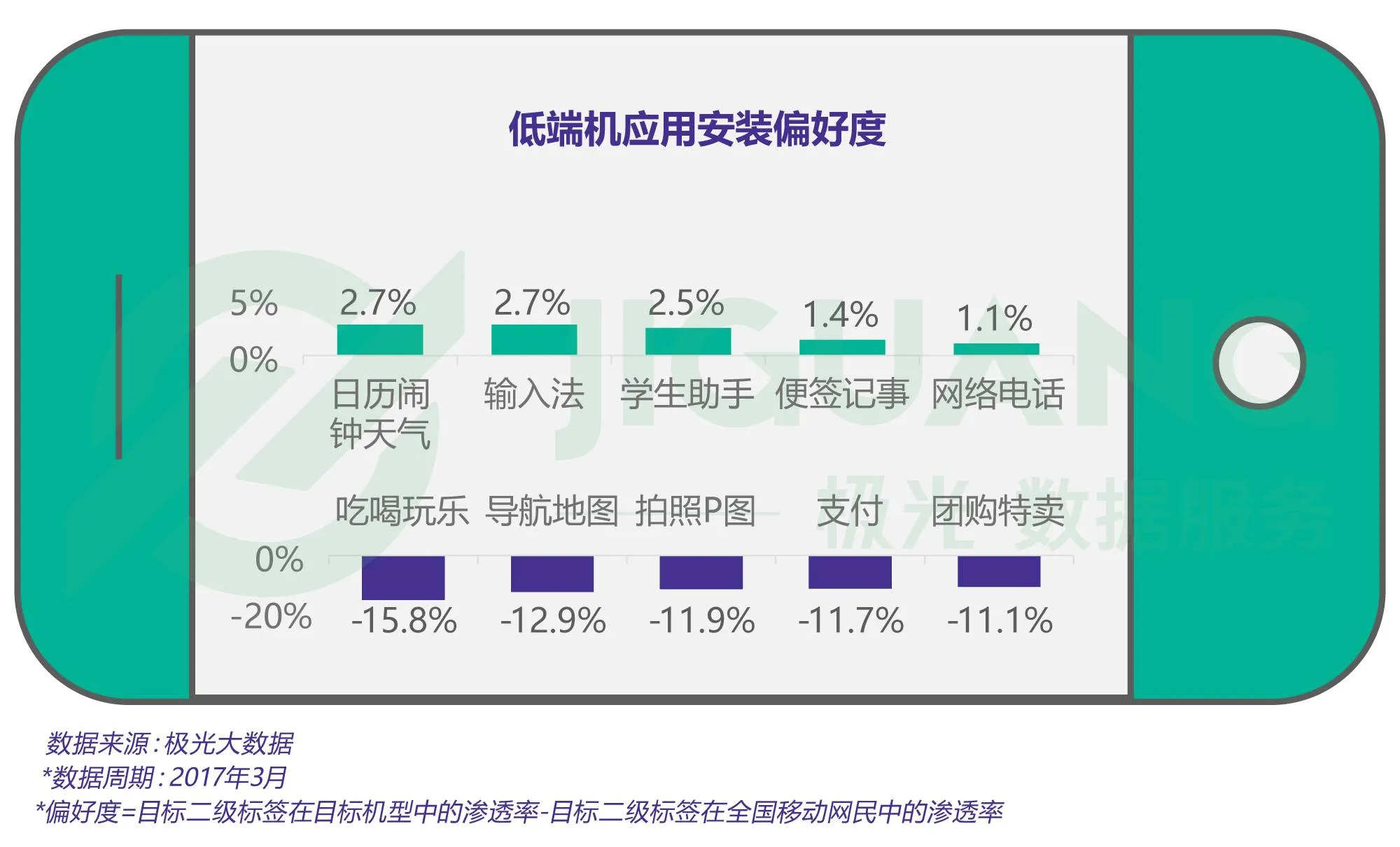 极光大数据显示,低端机用户最关注的应用软件类型是日历闹钟天气app,对导航地图类app的需求明显低于国内移动网民整体水平