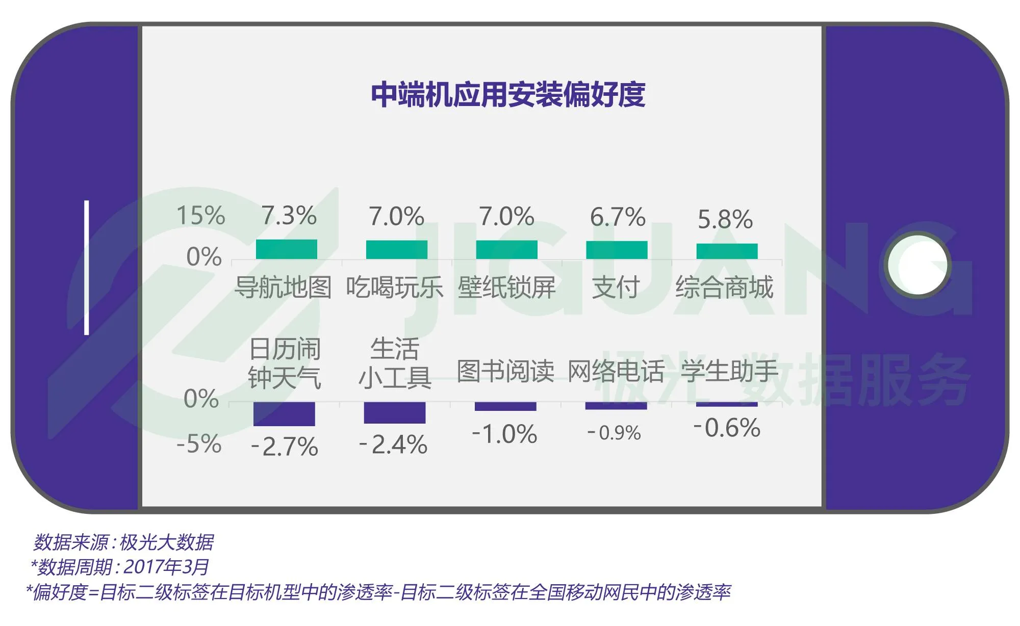 根据极光大数据统计,中端机用户对导航地图、吃喝玩乐类型的应用偏好度最高,该类应用在中端机用户中的渗透率比在全国移动网民中的渗透率高7%左右,同时中端机用户对支付和综合商城类应用的偏好度也较高