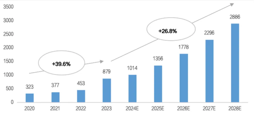 2020-2028年中国智算中心市场规模及预测(亿元)