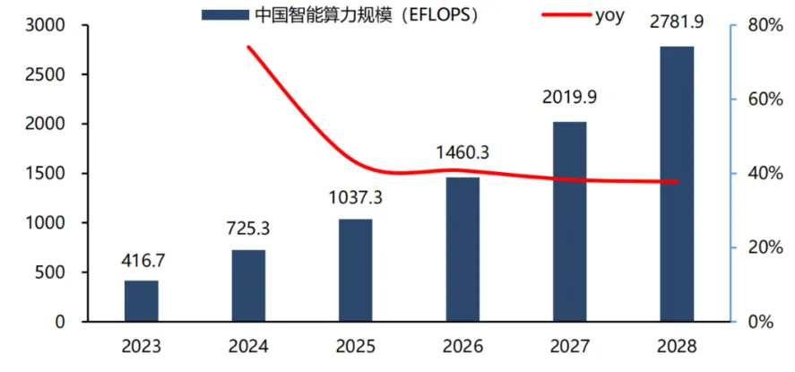 2028年我国智算规模将达到2781EFlps。根据IDC测算,2024年我国智能算力规模725.3EFLOPS(FP16);预计2028年我国智算规模达到2781.9EFLOPS,2024-2028CAGR 40%。