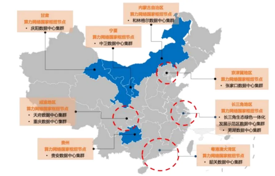 贵州枢纽 | 全国智算高地,大模型训练基地 | 气候条件适宜自然冷却;政策补贴(算力券)吸引大模型训练 | 网络时延较高(10ms至东部),跨区域传输成本高 | 目前贵州总算力规模增长28.8倍,智算规模占比超过八成。贵州全省在建及投运数据中心39个,大型以上数据中心22个,服务器承载能力超过244万台。 | 到2025年,贵州省数据中心标准机架达到80万架、服务器达到400万台,PUE小于1.2,率先建成全国领跑的算力基础设施。 |