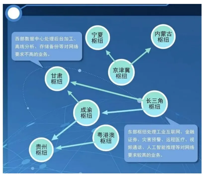 宁夏枢纽 | 数据备份与中低时延业务中心,全国首个万卡智算基地 | 清洁能源优势 | 业务类型以数据备份为主,高附加值服务不足 | 截至2024年6月底,中卫数据中心集群累计标准机架达8.4万架,拥有大型、超大型数据中心16个,上架率超过77%,为国内4000余家企事业单位提供算力服务。 | 到2025年全面建成宁夏枢纽,标准机柜达72万架,总投资超7000亿元,可再生能源使用率提升至65% |