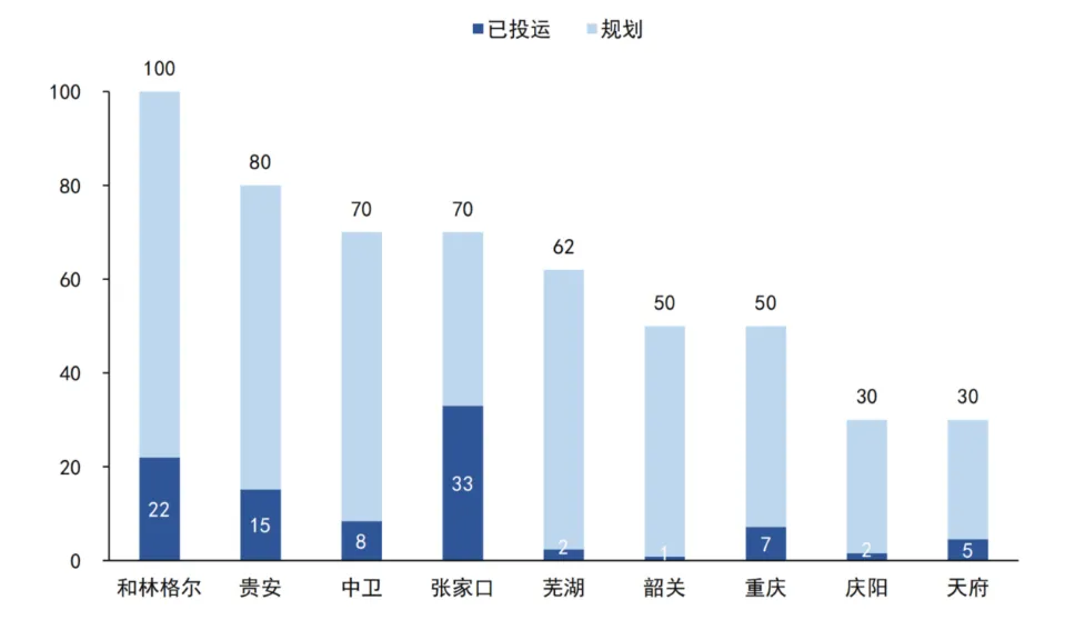 我国数据中心集群已投运及规划机柜书目(2.5KW,万架)