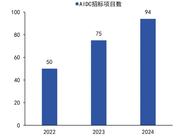 人工智能快速发展带动AIDC规模迅速扩大。2022至2024年间,AIDC的招标项目共计219个,广泛覆盖28个省份及81座城市。其中,2022年总数为50个,2023年跃升至75个,而至2024年项目数量激增至94个,这一显著增长趋势清晰地表明了AIDC建设的持续扩张态势。