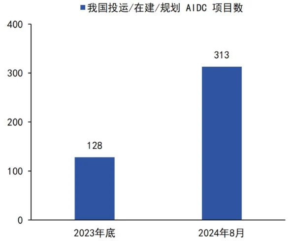 我国AIDC项目加速落地。截至2023年底,全国投运/在建/拟建的AIDC项目共计128个,其中39个已投运。而截至2024年8月,中国AIDC项目已经超过300个,已公布算力规模超50万Pflops,2024年当年投产的项目超过50个,总计新增算力规模约2万PFlops。