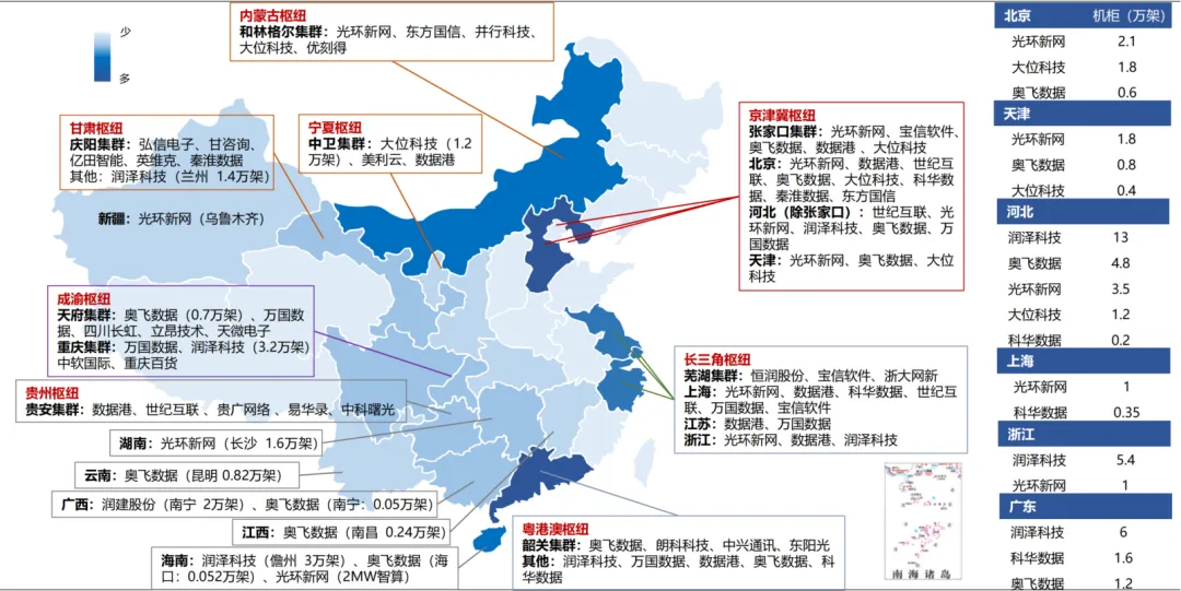 光环新网 | 京津冀及内蒙大规模布局:持续深化在京津冀、长三角地区的布局。在2025年 4月启动天津宝坻三期项目建设。在内蒙古规划建设和林格尔新区智算中心项目(规划 27,000个机柜)和呼和浩特算力基地项目(规划 34,000个机柜)。 | 天津宝坻三期:预计支持140 MW IT负载(约 31,800个 4.4KW等效机柜),总投资约35.37亿元人民币。内蒙古总投资:两个项目总投资约35.3亿元(12.35亿 + 22.95亿)。算力规模:截至目前,公司算力业务规模已超过4,000 P,。 |