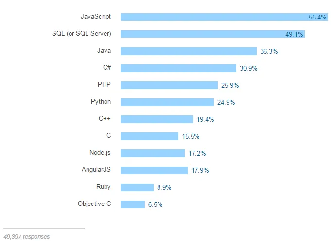 在语言方面,JavaScript 仍然以压倒性的优势当选最受欢迎开发语言,超过 55.4 的受访者称自己使用这么语言。实际上前 5 名的排名与去年都是一样的,分别是(JavaScript、SQL、Java、C# 以及 PHP)。但 PHP 的受欢迎程度则比去年下跌了 4 个百分点,Stack Overflow 分析认为是由于 Node 和 Angular 的崛起。