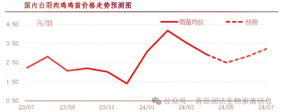 5月可淘汰大周龄种鸡数量较多,在产父母代种鸡存栏量有减少可能,因此6月孵化场出苗量或减少,加之毛鸡价格或上行,提振养殖端补栏积极性,供需双面提振市场,鸡苗均价或上行。6月部分换羽种鸡开产,总开产量略大,在产父母代种鸡存栏量或较5月提升,7月孵化场出苗量或再度增多,但由于毛鸡价格或继续上涨,对鸡苗市场需求提振作用较强,鸡苗价格或继续上行。