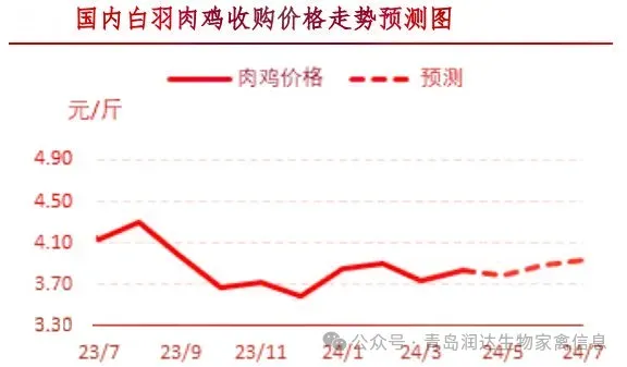 从产品市场需求来看,气温升高,产品市场或面临季节性回暖趋势,5月替代品生猪市场延续低位,一定程度利空肉鸡市场,博弈之下,预计5月产品市场整体回升空间有限,届时毛鸡出栏增加,预计5月鸡价稳中微降;6月毛鸡出栏量虽预期增加,但需求或继续恢复好转,预计鸡价或低位上涨。7月产品市场需求尚可,届时毛鸡出栏量窄幅减少,企业收购难度有所增加,预计鸡价或继续小幅上涨。5月,产品市场消费适当回暖,经销商及食品加工企业适量补货,多随用随采。产品产量提升,厂家产品库存整体偏高调整,供需作用下,产品价格整体微降。6-7月产品产量或有下降,厂家产品库存压力减小,加之气温提升,部分单品需求提升,产品价格或有走高。817小白鸡苗:根据当前孵化企业上孵心态进行预测,预计5月鸡苗供应量增加。短期养殖户补栏积极性尚可,鸡苗价格延续高位运行。但中下旬鸡苗供应增加,市场空棚率降低,养殖户补栏积极性或转淡,鸡苗价格或有所回落。