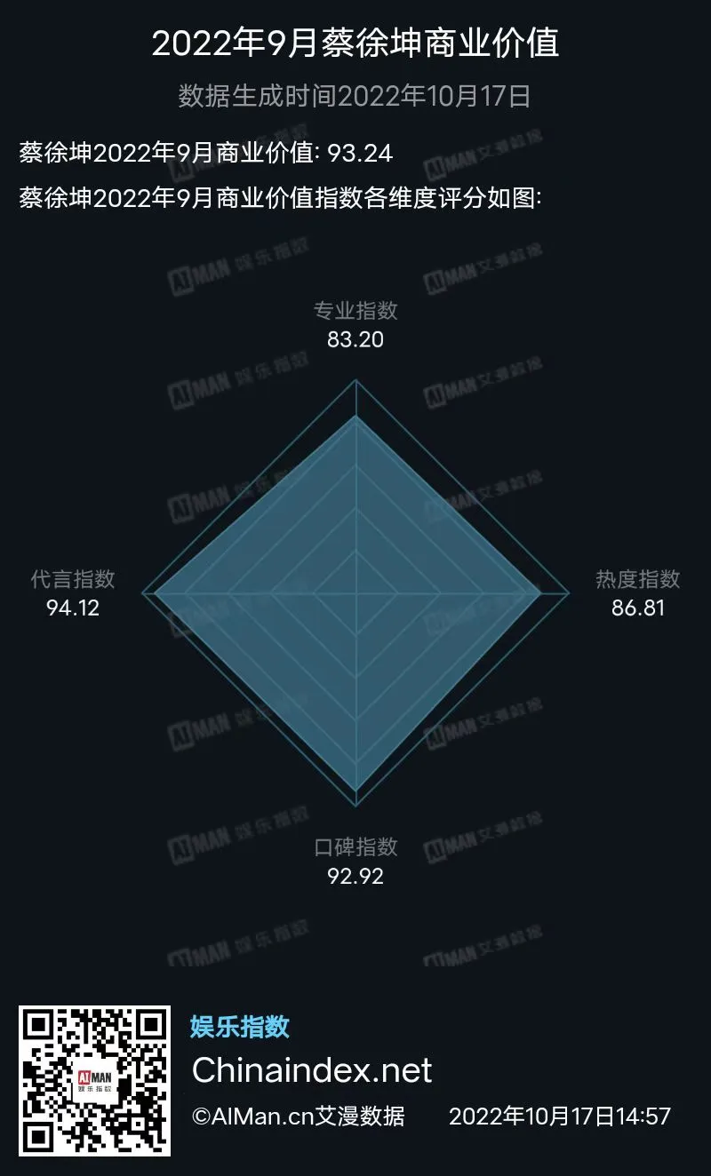 9月,蔡徐坤的商业价值蹿升,成绩优异。