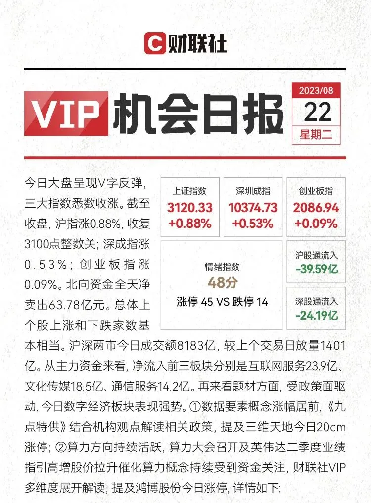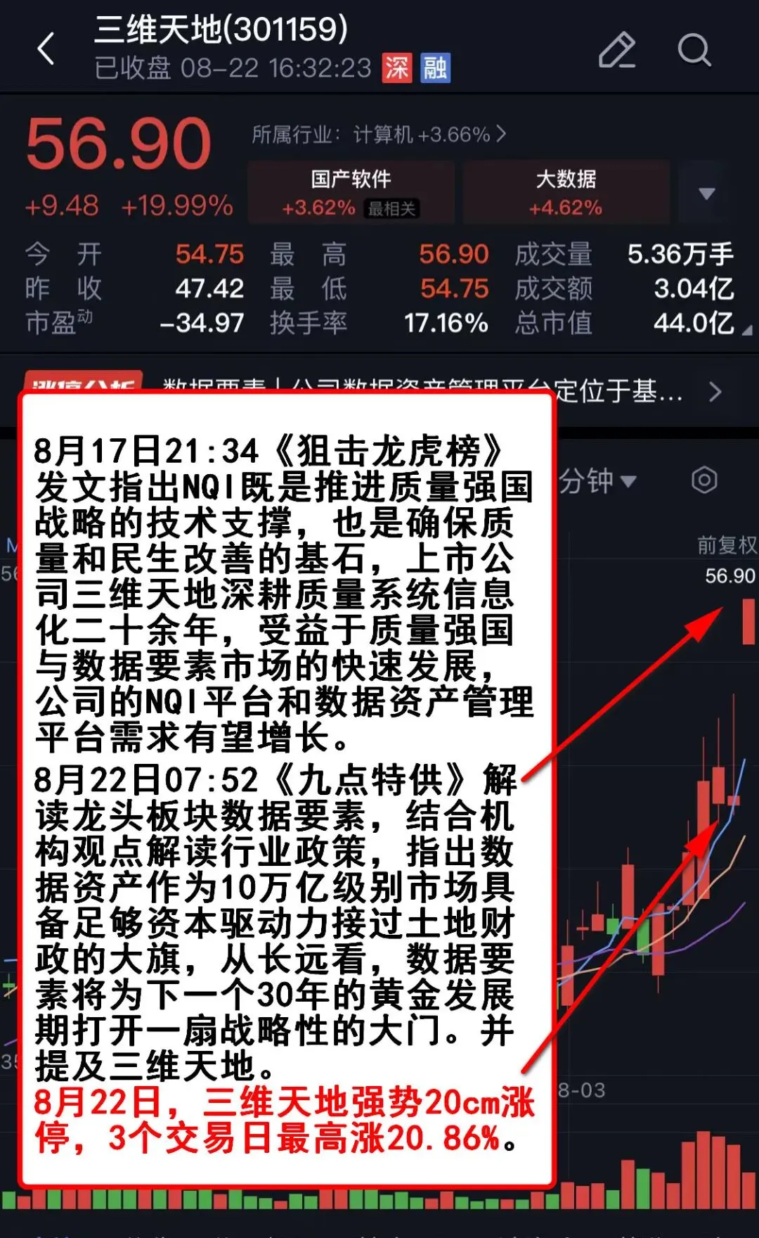 8月22日07:52《九点特供》解读龙头板块数据要素,结合机构观点解读行业政策,指出数据资产作为10万亿级别市场具备足够资本驱动力接过土地财政的大旗,从长远看,数据要素将为下一个30年的黄金发展期打开一扇战略性的大门。并提及三维天地。