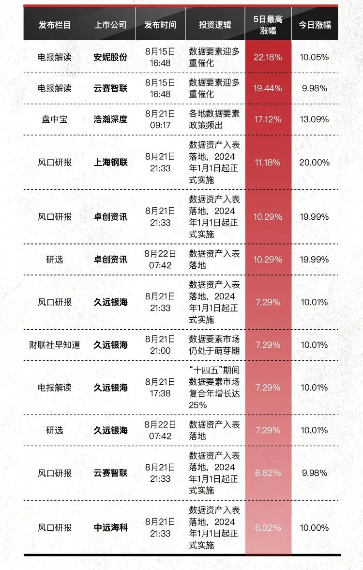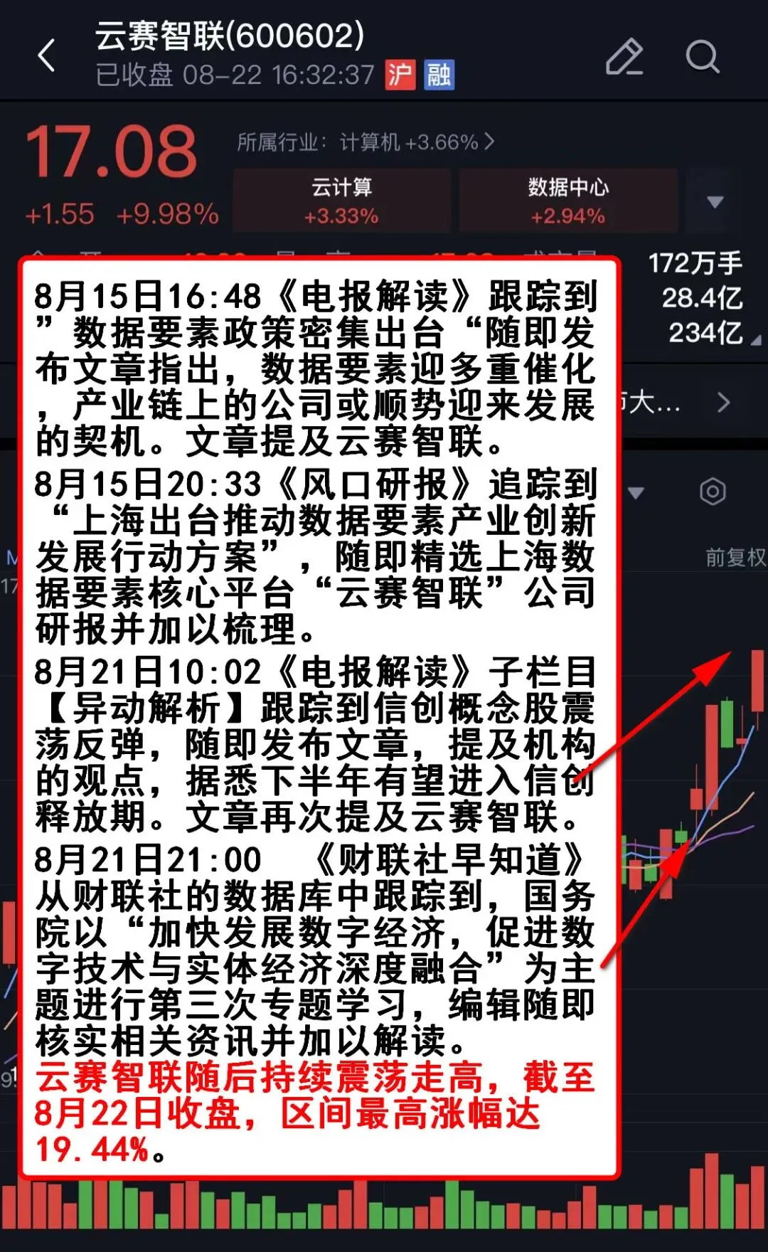 8月15日16:48《电报解读》跟踪到”数据要素政策密集出台“随即发布文章指出,数据要素迎多重催化,产业链上的公司或顺势迎来发展的契机。文章提及云赛智联。