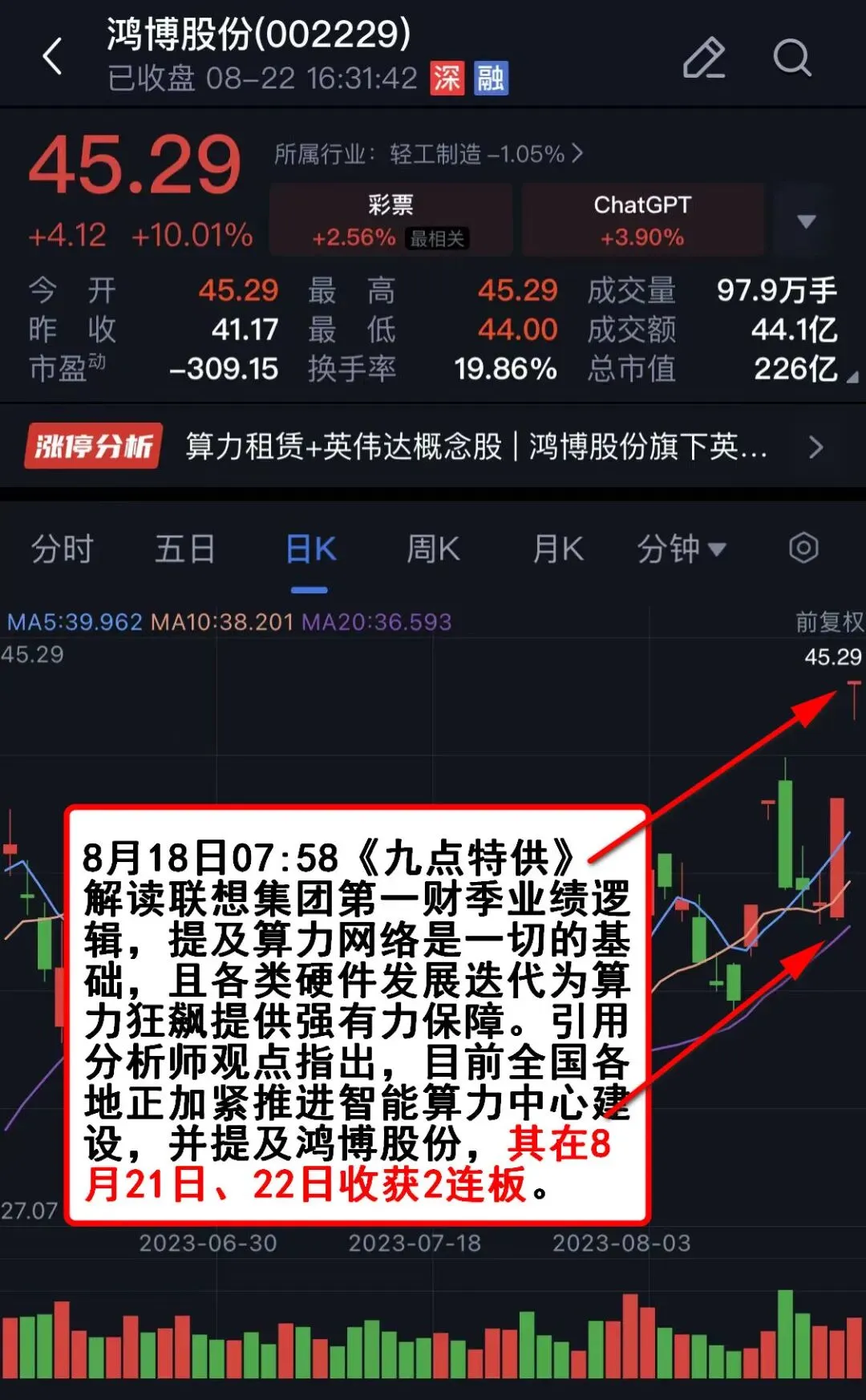 8月18日07:58《九点特供》解读联想集团第一财季业绩逻辑,提及算力网络是一切的基础,且各类硬件发展迭代为算力狂飙提供强有力保障。引用分析师观点指出,目前全国各地正加紧推进智能算力中心建设,并提及鸿博股份,其在8月21日、22日收获2连板。