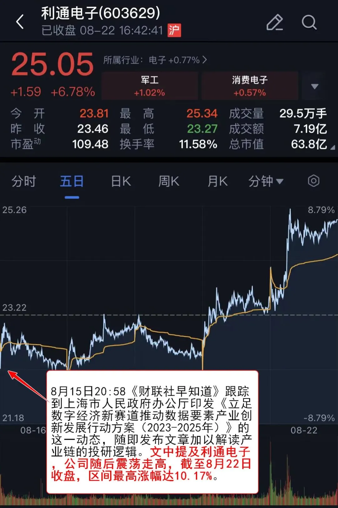 8月15日 20:58《财联社早知道》跟踪到上海市人民政府办公厅印发《立足数字经济新赛道推动数据要素产业创新发展行动方案(2023-2025年)》的这一动态,随即发布文章加以解读产业链的投研逻辑。文中提及利通电子,公司随后震荡走高,截至8月22日收盘,区间最高涨幅达10.17%。