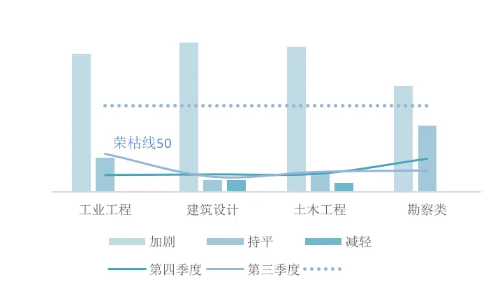 具体来说,企业在项目争取难度上,58.6%的企业认为更加困难,较第三季度73%得到缓解,41.4%的企业认为难度与上期相对持平,没有企业在项目争取中觉得相对轻松。