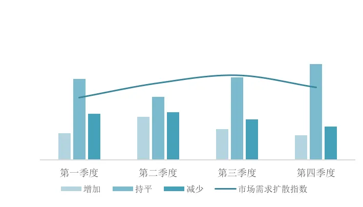 参考图6,第四季度业务需求扩散指数为47.2,环比增长1.1%。16%企业在本季度的市场需求增加,这一占比较第三季度减少20%;62.3%企业市场需求保持稳定,这一占比较第三季度增长15.4%;21.7%的企业市场需求萎缩,占比较少季度减少16.5%。第四季度新签合同状况较好,新签合同额扩散指数为69,环比增长8.7%。