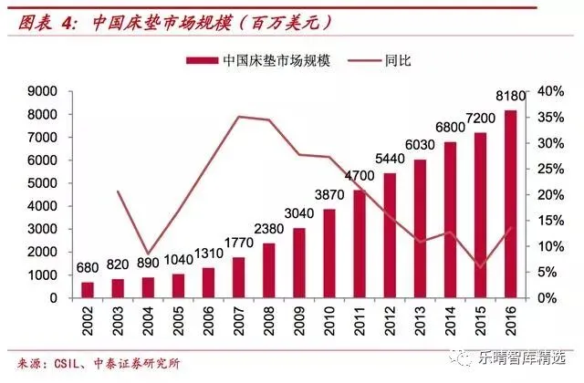 根据ISPA数据显示,中国床垫消费总额从2002年的6.8亿美元增长到2016年的81.8亿美元,CAGR达到19.4%,已经超越美国成为全球最大的床垫消费市场,近五年增长速率略有下滑,但仍保证平均13%增长率,市场规模增速可观。