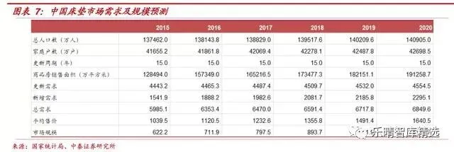 我们假定每户人口数不变和人口自然增长率不变,每个家庭有2张床垫且80%(考虑经济和习惯因素)的家庭使用床垫。由此可算得2020年我国更新需求可达到4554.5万张床垫。