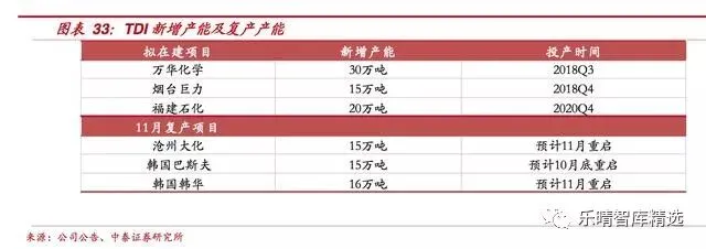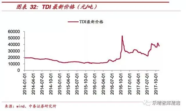 另一方面,产能端万华化学、烟台巨力、福建石化2018年均有新增产能投放,11月沧州大化将重启运行,韩国方面检修装置亦将陆续恢复开车,2018年TDI又将新增45万吨产能,其价格上涨趋势难以持续。