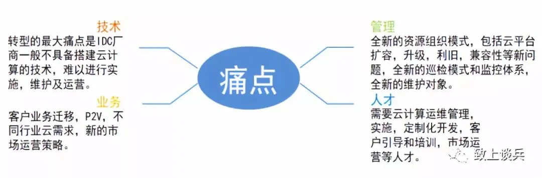 IDC云化的痛点主要表现在技术、管理、人才和业务等方面。IDC云化最大的痛点是IDC企业一般不具备搭建云计算的技术,难以进行实施、维护以及管理;在管理方面,表现在IDC云化需要全新的资源组织模式、全新的巡检模式和监控体系和全新的维护对象;在人才方面,表现在IDC云化需要云计算的运维管理、实施、定制化开发、客户引导和培训、市场运营等人才;在业务方面,表现在IDC云化需要客户业务迁移,适应不同行业云需求以及需要新的市场策略。