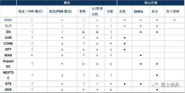 从IDC公司IDC的模式来看,目前大部分批发型IDC都是TKF模式,大都提供互联服务,且大都分布于欧美核心区域。TKF模式(Turnkey Flex)相当于精装房的交钥匙模式,机房包间已经安装好配电和空调容量,客户只需要将设备运入上电即可。由于客户类型不一,客户的设备也无标准尺寸,所以通常不做通道密闭。PBB模式(Power based building/Powered shell)相当于住宅毛坯房,公司租下/拥有物业权,和容量规模较大的客户签订较长租赁托管合同,机电设施可以由租户自行设计和建设,也可以由租户出设计理念,剩下设计和建设,投资交由IDC公司。