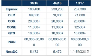 全球IDC互联收入呈现较快增长趋势。Equinix2017年一季度互联收入同比增长18%,达到总经常性收入的16%,美洲、亚太和EMEA的互联收入分别为经常性收入的24%、13%和8%,并且大多数增长来自于交叉连接,云交换保持继续增长态势。Digital Realty互联在2017年一季度贡献了0.57亿美元的收入,同比增长4%,互联收入占总收入的10.4%,新兴的服务交换平台(基于该公司与Megaport的合作伙伴关系)到年底将从全球8个美国市场扩展到数字三个地区的17个市场。