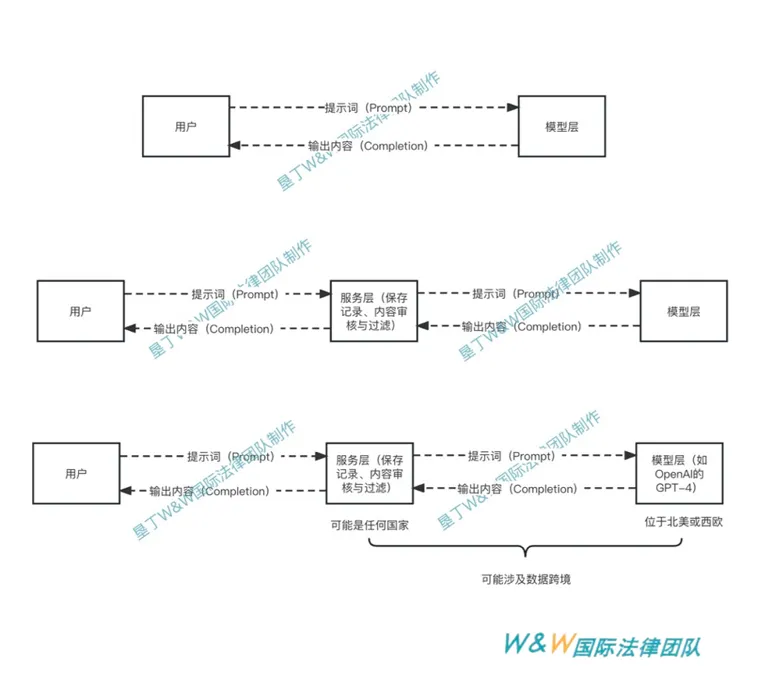 根据垦丁W&W国际法律团队服务的过往客户的案例,并非每个公司都会选择自行部署AIGC模型,大多数公司会选择使用市场上较为成熟的模型的对外API、按量计费的服务,如OpenAI的GPT-4或者Anthropic的Claude。此类服务的服务器一般部署于西欧以及北美。而运行服务层代码的服务器可能根据公司产品的目标市场的法律法规、服务器延迟等多种因素,被部署在不同的国家或地区,服务层与模型层之间的数据流转可能涉及数据跨境。