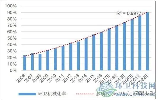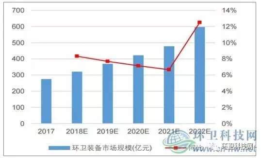 根据统计,2017年,我国环卫车总产量为133473辆,增产46721辆,增幅达53.86%;销量达136359辆,同比增加28488辆,增幅达26.37%。以销售均价20万元/辆计算,当前市场规模约为273亿元。预计到2022年,全年环卫装备市场销售规模将达到595亿元,年均增长率约为16.86%。