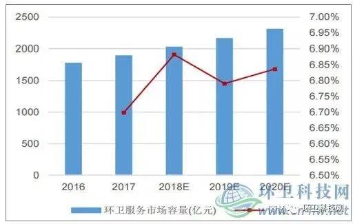 环卫服务市场收入主要由道路清扫、垃圾收运以及公厕运行三部分构成。按当前市场平均价格估算,2016年,全国城市县城及村镇环卫服务市场容量可达1773.42亿元。按照全国道路清扫面积、垃圾收运量以及公厕数量的年增长速度,以各服务项目2016年市场容量占比为权重,不考虑服务单价的变动以及无法预期的市场波动,估算全国环卫服务市场容量到2020年将达到2307.40亿元,年均增速6.80%。