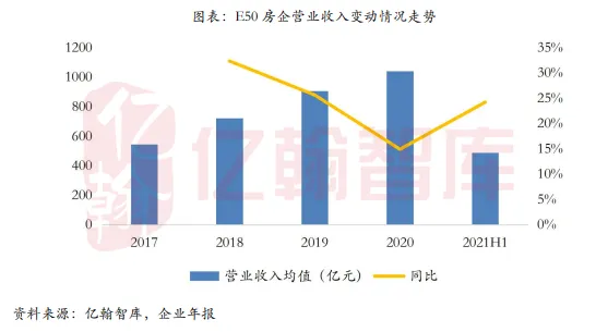 从数据上看,营业收入增长速度保持放缓的趋势,2021年上半年E50房企的营业收入同比涨幅为24%,虽较2020年全年涨幅有所提高,这与2020年同期疫情影响造成的低基数效应有关。