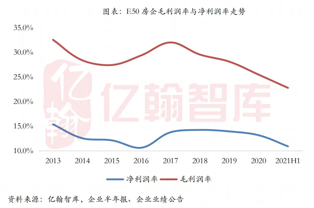 从房企利润率数据走势来看,无论是毛利润率还是净利润率都呈现出明显的下滑趋势。2021年上半年,E50房企的毛利润率均值为22.8%,较2020年下滑2.7个百分点,净利润率均值为10.9%,较2020年下滑2.3个百分点。