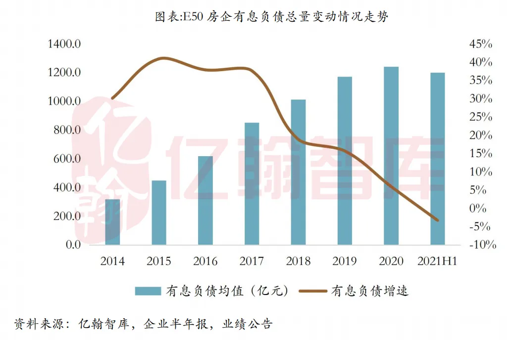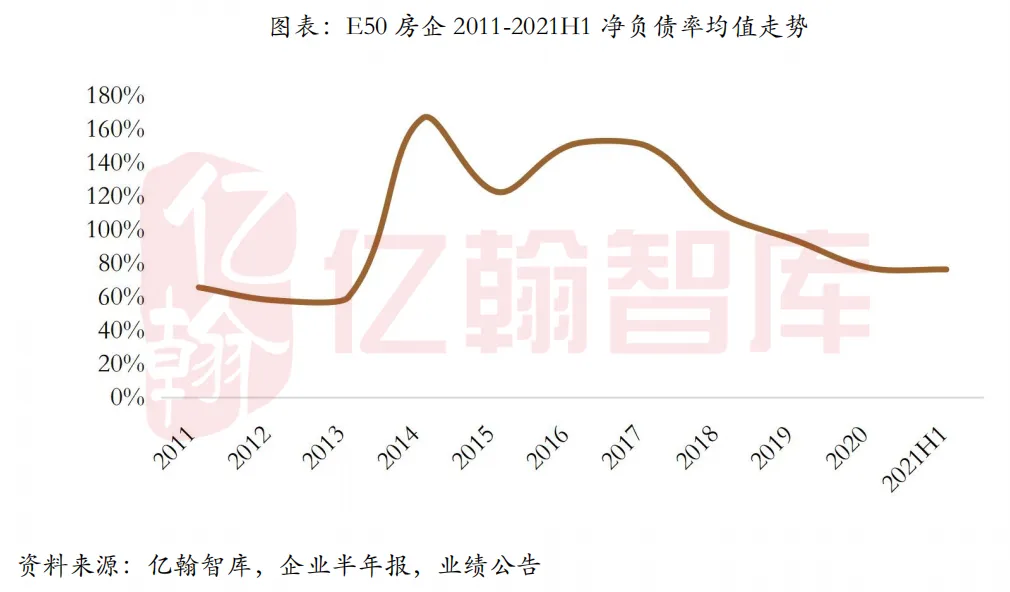 鉴于此,行业内绝大多数企业都在努力推进“三道红线”达标工作,从2021年中期企业公布的有息负债及“三道红线”指标情况来看,各企业的去杠杆、降负债工作均取得了实质性进展。E50房企有息负债增长的下滑趋势持续,截止2021年6月30日,E50房企的有息负债均值较2020年末数据的涨幅已由正转负。净负债率均值已由高峰期的接近170%下滑到2021H1的不足80%,降负债、优杠杆、控节奏的成效显著。