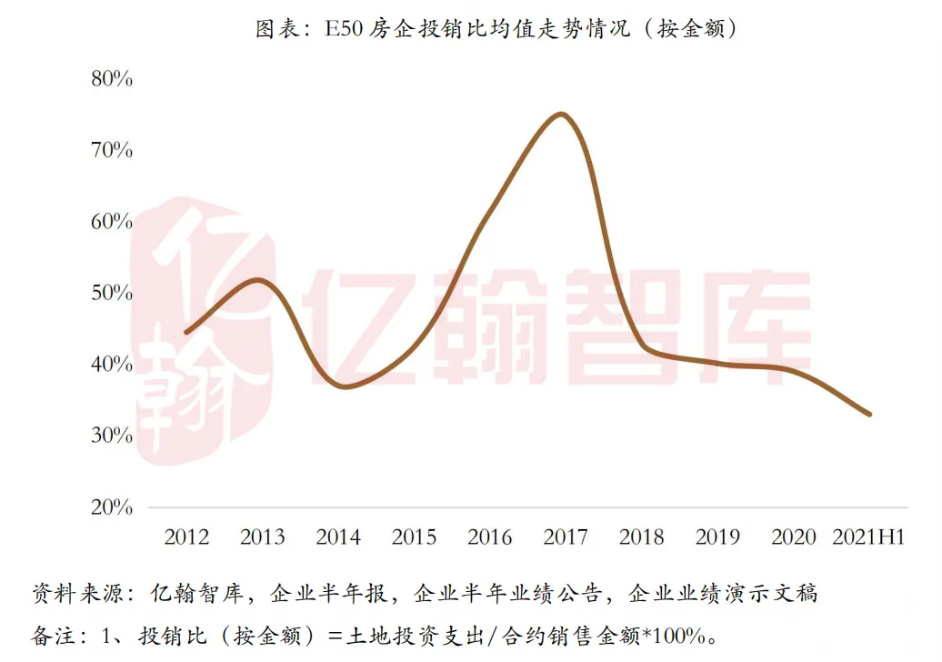 从房企整体拿地的资金投入来看,高扩张力度的阶段已经过去,2016年至2018年,行业的上行阶段内,房企拿地扩张的意愿极其强烈,对于市场上行的预期有更高的确定性,所以更愿意放手一搏,但其后对于市场的预期出现转变并不断稳定后,对于拿地决策也出现较为明显的转变,谨慎考虑更多,整体的投销比也出现了较为明显的下滑,2021年上半年,E50房企投销比均值已在40%以下。