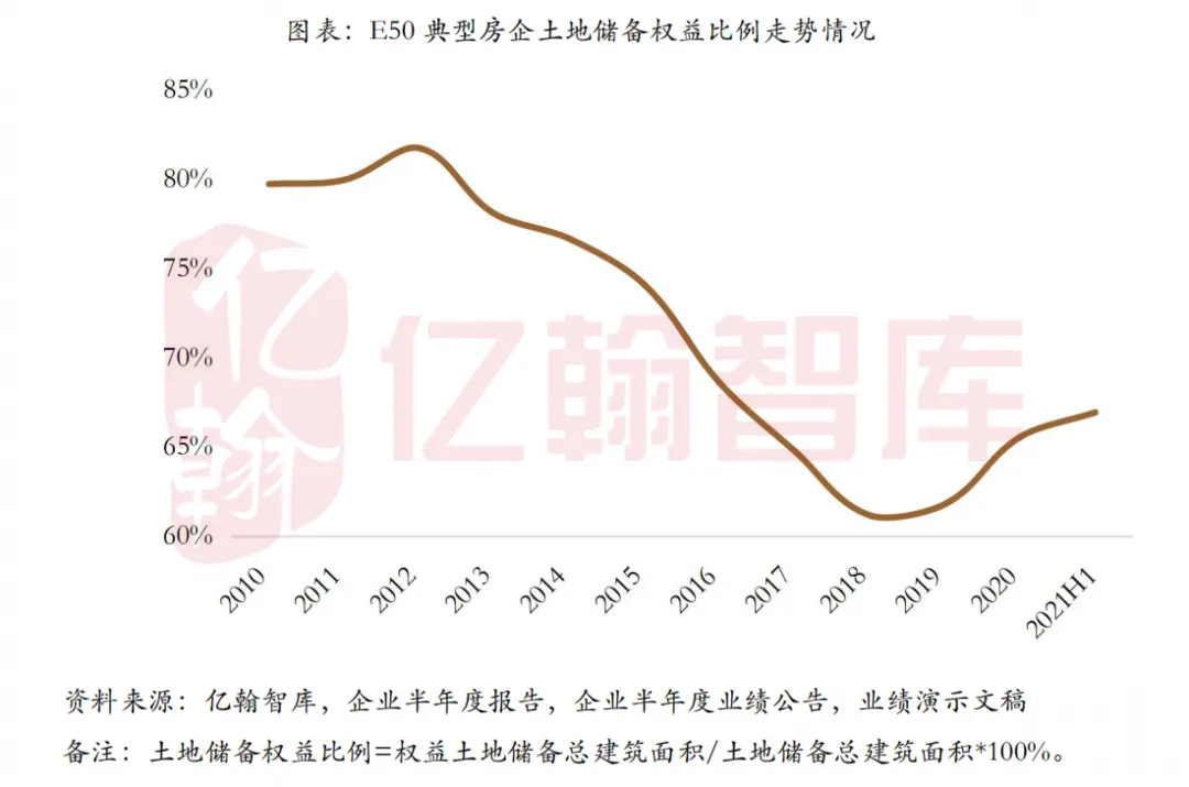 从E50典型房企的土地储备权益占比走势来看,权益比例这一数值保持着反弹回升的态势,但至2021年6月30日,典型房企的权益比均值仍在70%以下,这或会成为一种常态化的现状存在,不太可能再回归到80%、甚至于90%的高权益比时代。房地产行业环境发生了较为明显的变化,企业与地产之外,地产之内的各方之间需要构建起更加紧密的合作发展关系,而不再仅仅局限在开发、销售端口,在此之外,为消费者提供更加全面优质的产品和服务才有可能更好的迎合市场的大趋势。