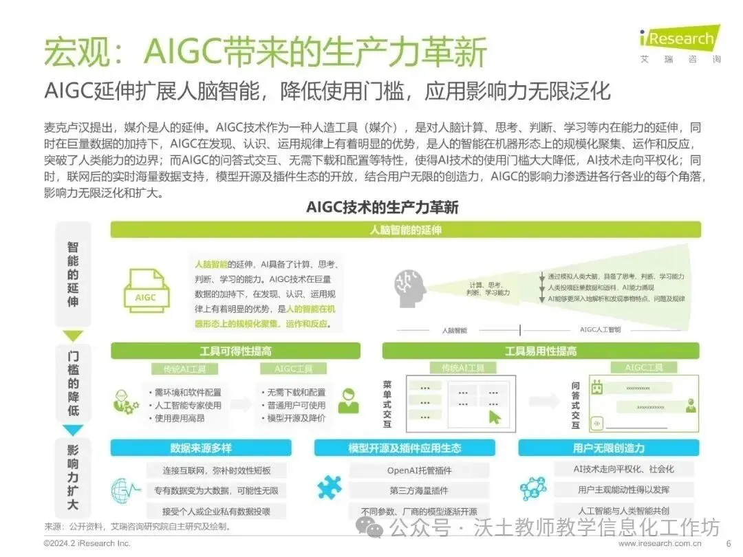 AIGC技术作为人脑智能的延伸,降低了使用门槛,使得AI技术的应用影响力无限泛化。它在教育领域的应用,从教学辅助发展到自适应学习,推动了大规模因材施教的逐步落地。