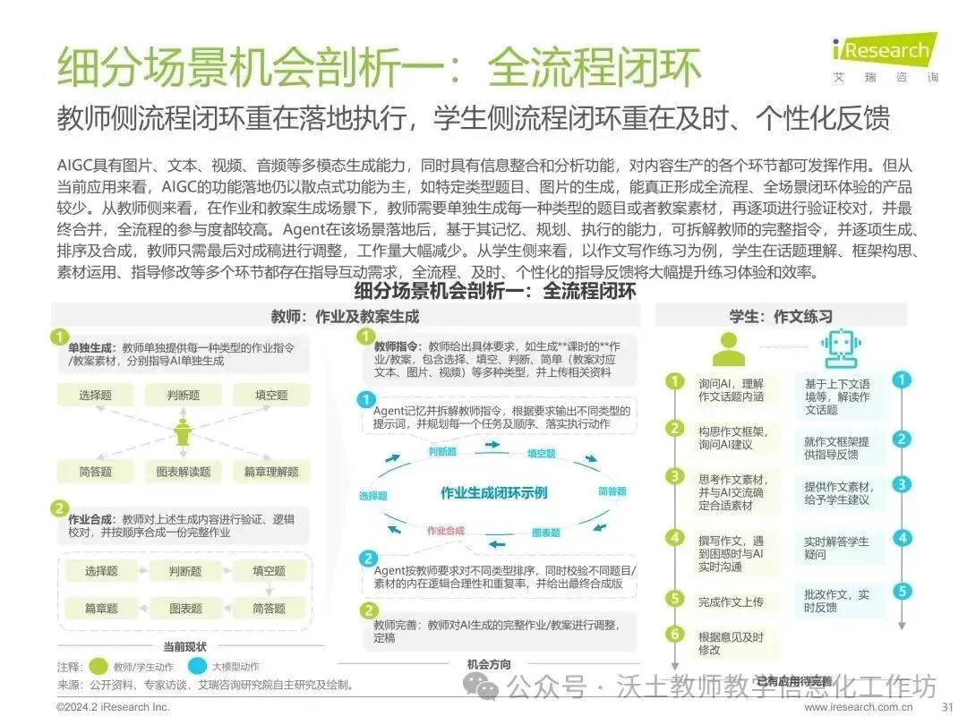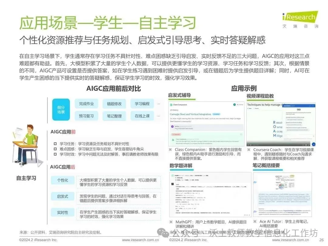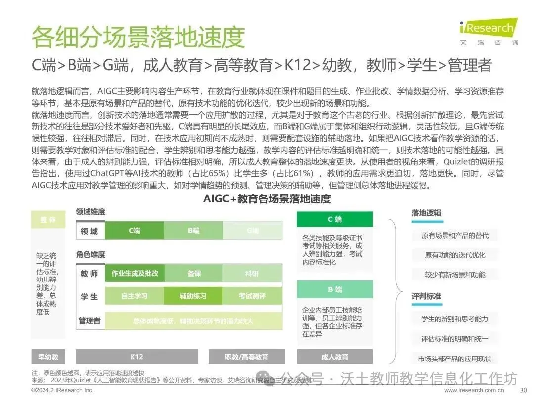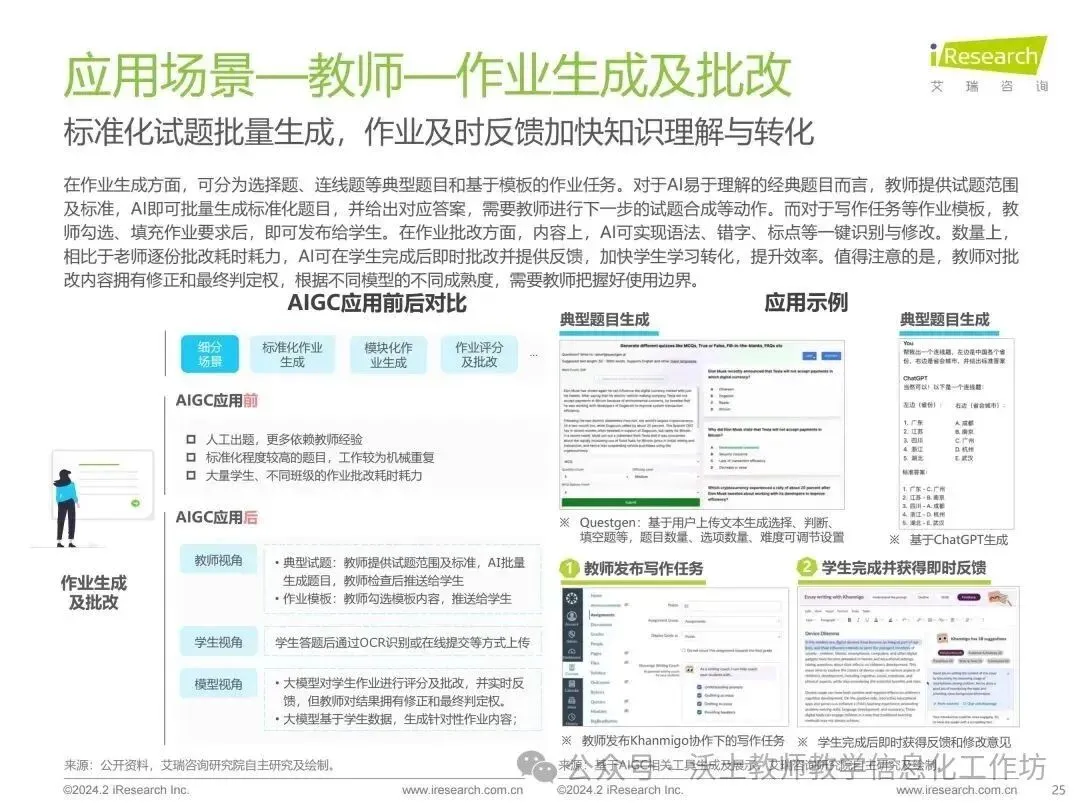 报告指出,AIGC技术在教育中的应用,如备课规划、作业生成和批改、自主学习、辅助练习、测试评估等方面,都显示出显著的潜力。然而,技术的落地速度和成熟度在不同领域和场景中表现出差异。