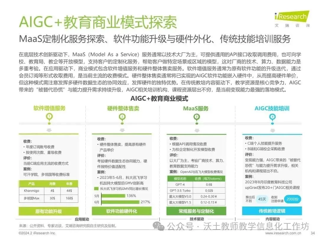 报告还提到了AIGC技术在教育领域的商业模式探索,包括MaaS服务、软件增值服务、硬件整体售卖以及AIGC技能培训等,这些都是教育行业未来发展的重要方向。