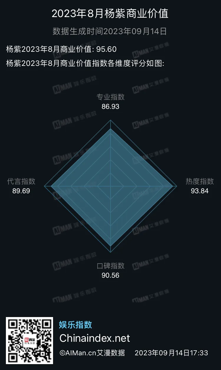 杨紫还在8月拿到怡丽丝尔品牌代言人,番茄小说品牌代言人两大新代言身份,口碑指数和代言指数均有所提升。因此,杨紫8月商业价值成绩也十分优异。