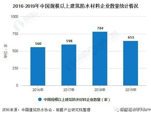 我国建筑防水材料产量逐年提升,但是目前市场还是处于“大行业、小企业”的特征,市场竞争剧烈,生产企业规模小、数量多、市场集中度低的特点仍然突出。根据中国建筑防水行业协会数据统计,截止到2019年末,规模以上(主营业务收入在2000万元以上)建筑防水材料企业653家,较2018年下降131家。