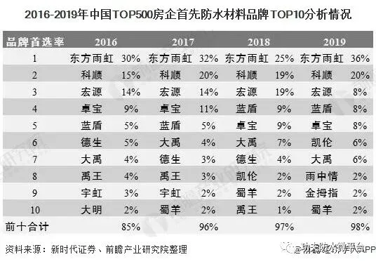 在房地产“赢者通吃”的背景下,注定也只有绑定B端大客户的防水企业可以最终胜出。防水龙头也将乘地产龙头的东风,一同扩大自己的市场份额。从500强房企的防水品牌首选率可见,东方雨虹的首选率长期稳居行业第一且不断增长。科顺一直维持在行业第二名的水准。前十防水品牌的总计份额在不断提升,2019年已基本对TOP500地产客户实现全部覆盖。