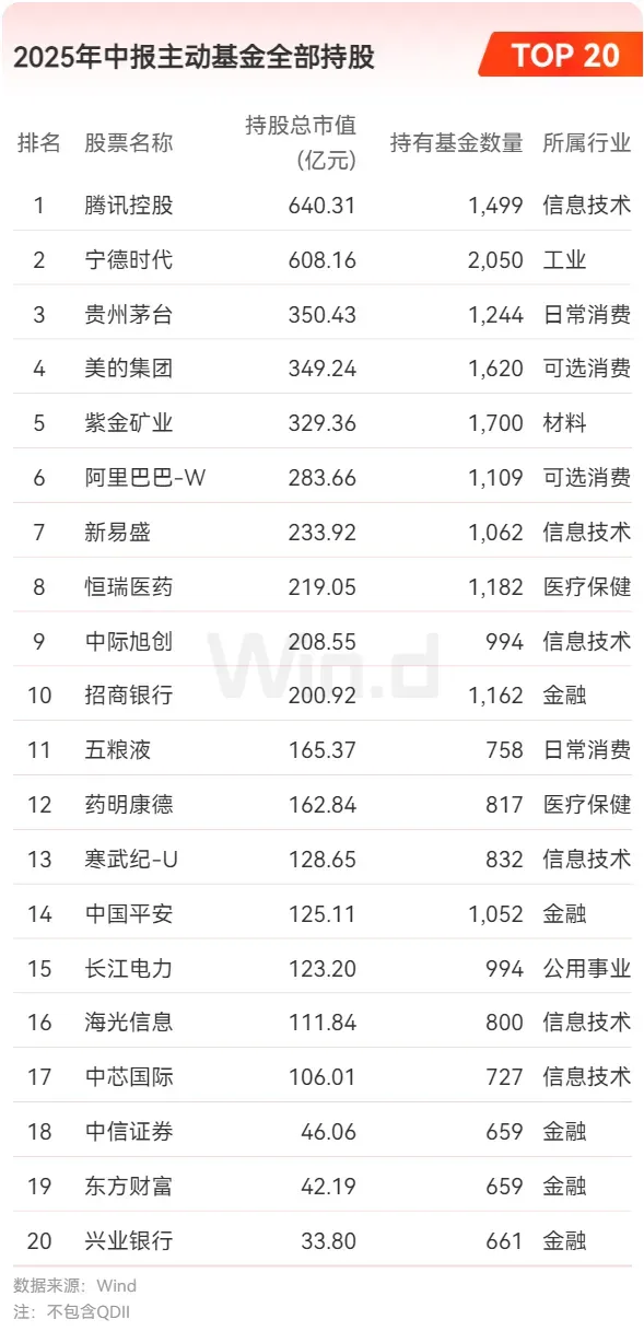 2025年中报,主动基金全部持股中前三大重仓股的所属行业分别为信息技术、工业和日常消费。其中,腾讯控股的持股总市值位列第一,达640.31亿元,被1499只主动基金共同持有。