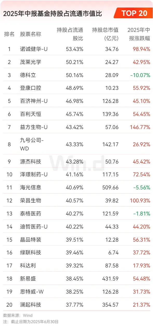 按持股占流通市值比统计,2025年中报公募基金持股占比高的股票在2025上半年获得显著的涨幅。
