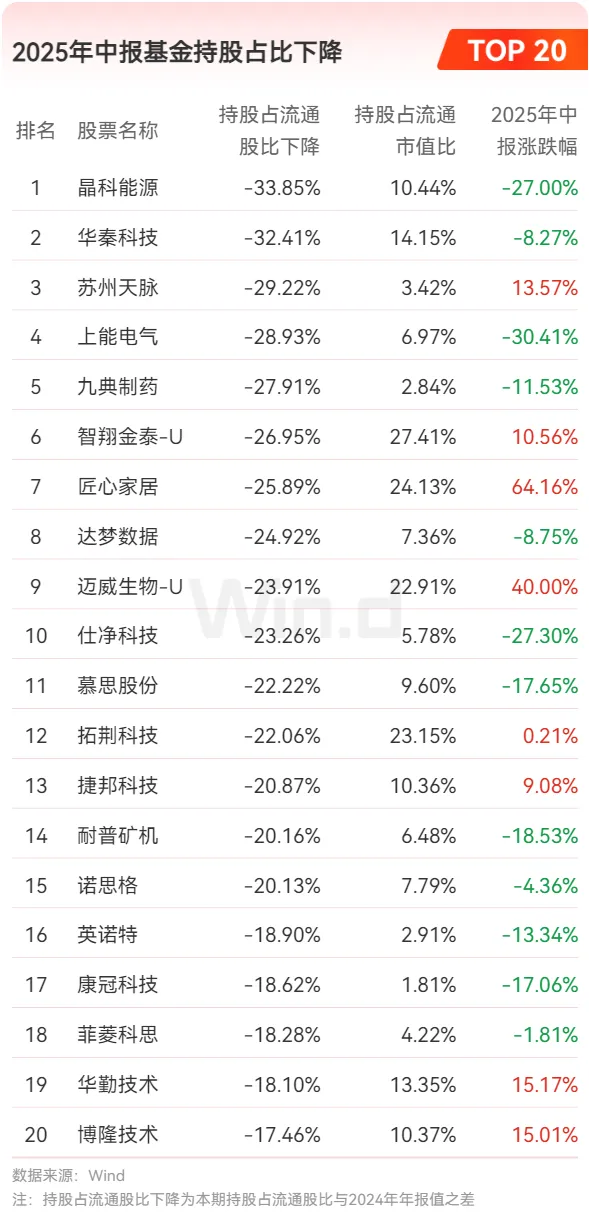 2025年中报公募基金大幅减持的股票普遍下跌。