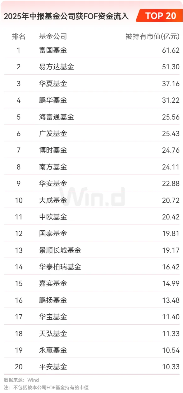 在剔除本公司FOF基金所持有的基金市值后,排序前三的基金公司为富国、易方达和华夏,被持有市值分别为61.62亿元、51.30亿元和37.16亿元。