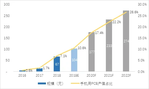 用同样功能的PCB,SLP能够大幅度减小HDI板的面积和厚度,厚度减少约30%,面积减小约50%,能够为电子产品腾出更多空间发展新硬件或增加电池容量。SLP适配SIP封装技术,SLP需求的一大提升方向在于其与SIP封装技术的契合。根据国际半导体路线组织(ITRS )的定义SIP(System in a Package)即系统级封装技术,是多个具有不同功能的有源电子元件与可选无源器件,例如包括处理器、存储器、MEMS等功能芯片和光学器件等集成在一个封装内,实现一定功能的单个标准封装件,从而实现一个基本完整的功能,形成一个系统或者子系统的封装技术。实现电子整机系统的功能通常有两种途径,包括统单芯片SOC(System on Chip)与系统化封装SIP。SOC是指将原本不同功能的IC,整合在一颗芯片中实现电子整机系统。近年来由于半导体制程的提升愈发困难,SOC发展遭遇技术瓶颈,SIP成为电子产业新的产业技术潮流。对于SIP而言,由于系统级封装内部走线的密度非常高,普通的PCB板难以承载,而SLP更加契合密度要求,适合作为SIP的封装载体。目前在印制线路板和载板制造工艺中,主要有减成法、全加成法与半加成法三种工艺技术:减成法:减成法是最早出现的PCB传统工艺,也是应用较为成熟的制造工艺,一般采用光敏性抗蚀材料来完成图形转移,并利用该材料来保护不需蚀刻去除的区域,随后采用酸性或碱性蚀刻药水将未保护区域的铜层去除。全加成法(SAP):全加成法工艺采用含光敏催化剂的绝缘基板,在按线路图形曝光后,通过选择性化学沉铜得到导体图形。半加成法(MSAP):半加成法立足于如何克服减成法与加成法在精细线路制作上各自存在的问题。半加成法在基板上进行化学铜并在其上形成抗蚀图形,经过电镀工艺将基板上图形加厚,去除抗蚀图形,然后再经过闪蚀将多余的化学铜层去除,被干膜保护没有进行电镀加厚的区域在差分蚀刻过程中被很快的除去,保留下来的部分形成线路。SLP虽属于印制线路板,但从制程来看,其线宽/线距为20μm/35μm,无法采用减成法生产,同样需要使用MSAP制程技术。Apple 引领市场朝类载板SLP 发展,符合高精度需求与SiP 封装技术:苹果新产品iphone以及Apple Watch采用线宽线距更小的"类载板"(SubstrateLike-PCB,简称SLP)技术,引领HDI 市场朝类载板发展,技术升级为产业带来新的商机。自2010 年起,苹果智能手机以及平板电脑主板采用Any Layer HDI 制程,2014 年由于功能不断提升、新增加尺寸且设计L型均带动了产业的蓬勃发展,目前苹果采用SLP 将加速类载板子行业的发展,但是由于类载板产线需要重新建设,初期的良率以及品质有待提升,领先者有望享受丰厚的利润空间。苹果在iPhone、Apple Watch等产品上已经大量使用SiP封装技术,其中iPhone6开始使用SiP技术,iPhone X中SiP占比已高达38%。目前各大手机品牌中只有苹果在其产品中使用了SLP,其中Watch Series 4中有一块SLP,iphoneXS中有两块SLP,Iphone XR MAX则有三块SLP,可以看出SLP在苹果产品中用量也在逐渐提升。其达他品牌手机和电子产品也不断有消息传出会采用SLP,但截至2019年上半年,实际推出的产品仍然大部分尚未采用SLP,这与SLP生产难度大,目前全球能够SLP批量供货的企业相对较少,大部分给苹果供货有关。目前三星和华为已经开始在少部分高端型号的手机上采用SLP,不论如何,全球高端智能手机和其他电子产品批量采用SLP只是时间问题。据战新PCB产业研究所统计,2018年全球类载板(SLP)市场规模达67亿元(接近10亿美元),市场几乎全部来源于苹果。预计2019年全球市场规模将达104亿元,同比增长54.68%,占手机用PCB总市场规模的10.6%。2019年开随着三星、华为等主流企业的手机及其他移动智能终端核心产品SLP采用率的提升,预计至2022年,全球SLP市场规模将达274亿元,占手机用PCB产值比重将上升至26.6%。2016-2022年全球类载板(SLP)市场规模及预测