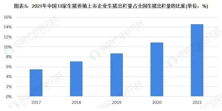 以生猪出栏量作为衡量行业集中度的标准,2017-2021年,中国13家生猪养殖上市企业生猪出栏量占全国生猪出栏量的比重呈逐年上升趋势,从2017年的5.5%上升到2021年的14.6%,上升了9.1个百分点,中国生猪养殖行业市场集中度虽然比较低,但是近年来不断上升。