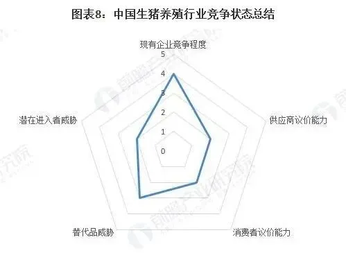 根据以上分析,对各方面的竞争情况进行量化,5代表最大,0代表最小,目前我国生猪养殖行业五力竞争总结如下: