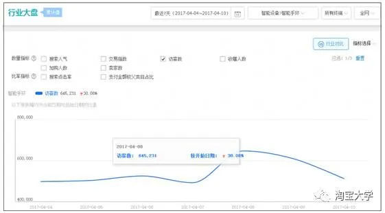 最近1天——如果你店铺内数据出现莫名的大幅度上升或者大幅度下降了(没有违规、不是大促、没有参加活动),你就可以看一下大盘的访客数最近一天的数据有没有大幅度上升或者下降,因为大盘是肯定影响你店铺数据的。如果你店铺的下降幅度远远高于大盘的下降幅度,那你就必须从其他方面去找找原因了。