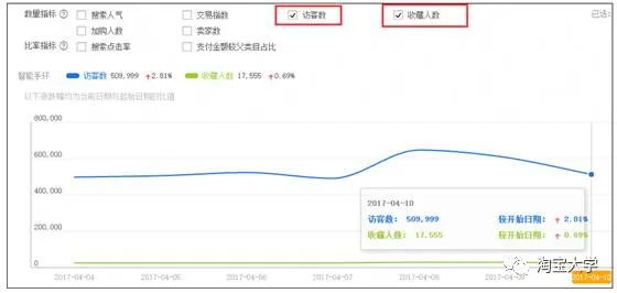 你就可以把这两个指标选中,把鼠标放在某一天的时候,这一天的数据就会出来,你根据公式就可以把收藏占比的趋势图在EXCEL中做出来。