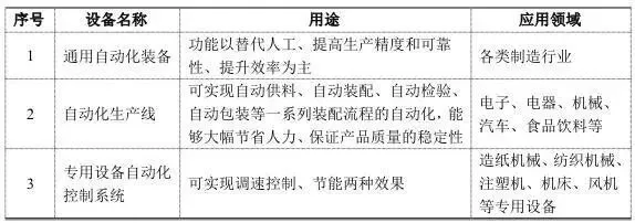 自动化设备的特点如下:①高度的自动化程序,无需人工操作;②工作效率高,提高企业生产效率;③整个工艺的生产流程稳定,提高产品的一致性,提升产品的标准化生产水平;④适合大批量生产,降低了企业生产成本。具体而言,各类自动化设备的用途及应用领域如下表所示: